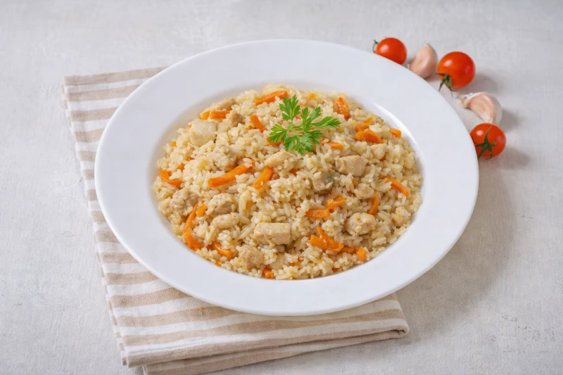 Курица, рис, морковь, лук репчатый, соль, перец черный молотый, вода, изюм, кумин, куркума, масло растительное, паприка